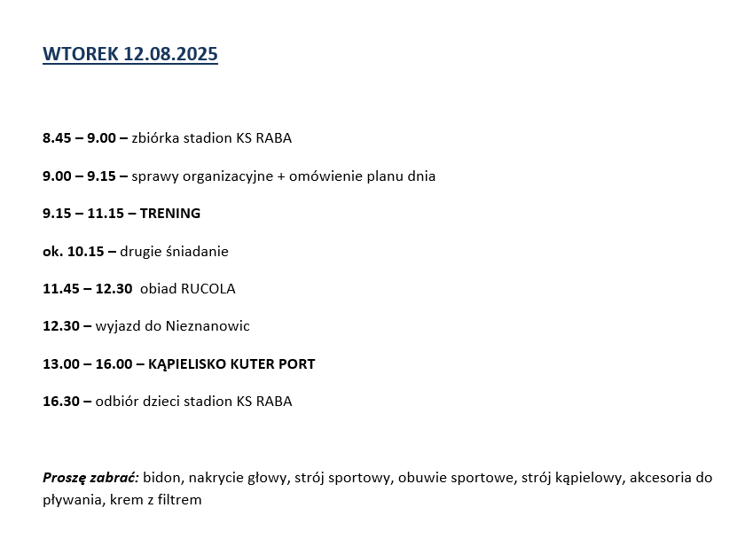 Obóz letni w KS Raba – wtorek 12.08.2025przez Raba Dobczyce6 lipca 202511 sierpnia 2025Klub Poniżej prezentujemy plan drugiego dnia obozu z KS Raba (wtorek 12.08.2025) . Prosimy o zapoznanie się z informacjami. Tagi:KS RabaWakacje